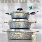 تابههای این سرویس از بهترین نوع گرانیت با خاصیت نچسب بسیار بالا ساخته شدهاند، که باعث میشود غذاها بدون نیاز به روغن زیاد پخته شوند و شستوشو نیز آسانتر شود. دستههای طلایی PVD نهتنها جلوهای خاص به محصول دادهاند، بلکه کاملاً مقاوم در برابر حرارت و ضربه نیز هستند.